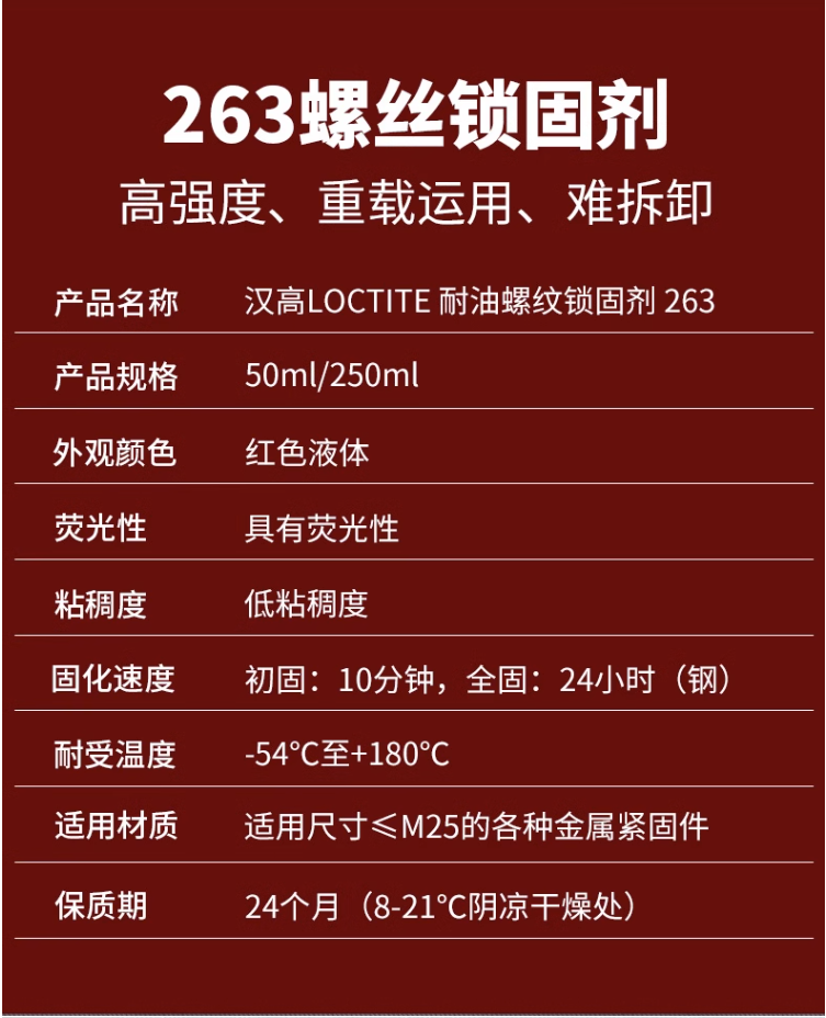 乐泰263螺纹锁固胶的技术参数: