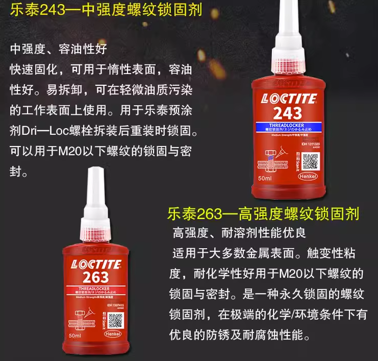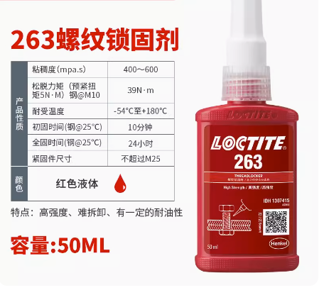 乐泰263螺纹锁固胶产品特性和优势:1、可防止冲击和振动引起的松动和泄漏:它会渗入配套螺纹间的凹槽并固化形成坚硬的热固性塑料,从而加固组件使其能够抵御冲击,并密封螺纹。