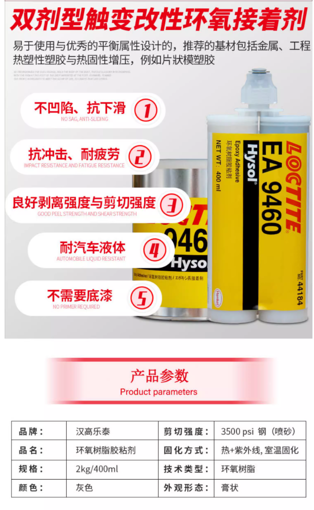 乐泰9460环氧树脂胶是一种双组分,触变性环氧胶粘剂具有很高的剥离强度,优良的剪切强度,其强硬,灵活,具有使用寿命长快速热反应。 40分钟适用时间
